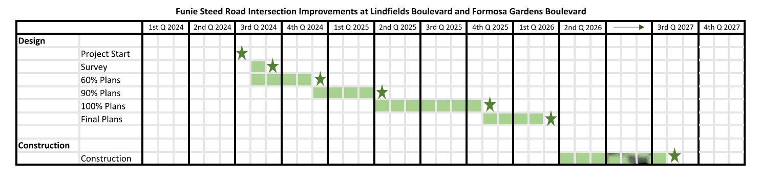 Improvements to Funie Steed Road at the intersections of Lindfields Boulevard and Formosa Gardens Boulevard are being designed to increase safety and capacity through the intersections. The project is being designed in accordance with a safety study conducted in 2022 by the Florida Department of Transportation, and a traffic analysis is underway at both intersections to confirm how best to accommodate existing and proposed traffic demands. The design effort currently includes:
