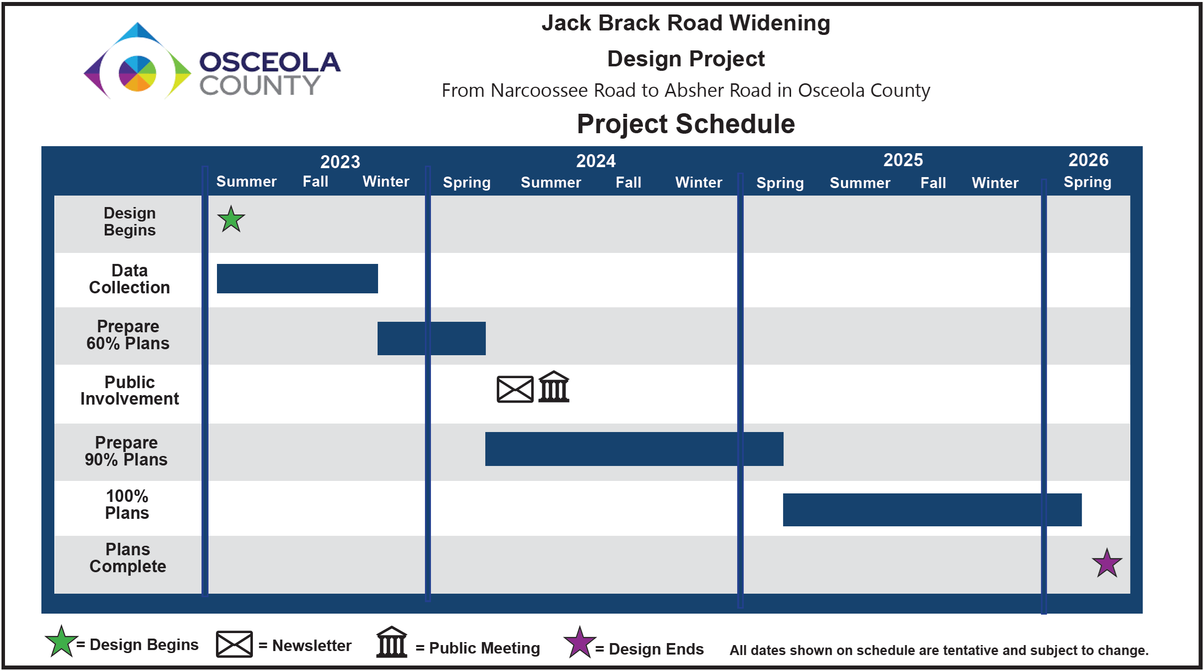 The purpose of this project is to improve the roadway and enhance safety along Jack Brack Road from Narcoossee Road to Absher Road, approximately 2.6 miles.