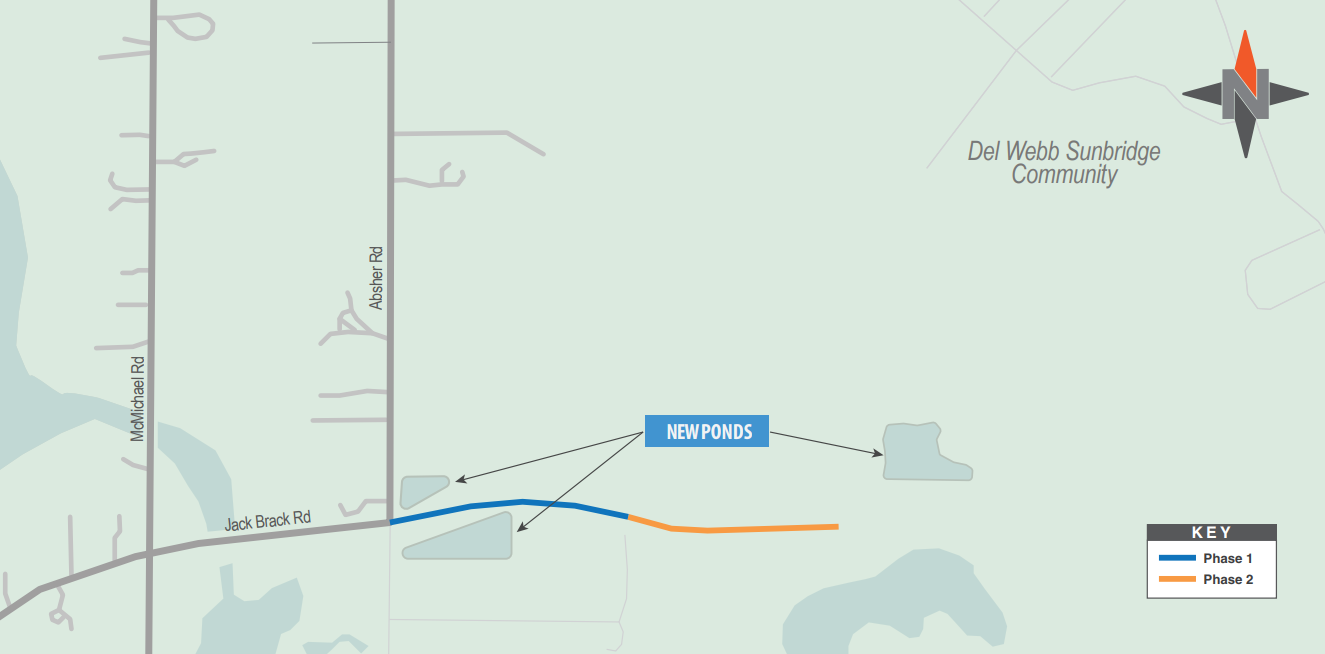 This Osceola County project, in partnership with Tavistock Development Company, will extend Jack Brack Road from Absher Road to the future south entrance of the Del Webb Sunbridge community. The planned four-lane roadway extension will be constructed in two phases: Phase 1 will extend from Absher Road approximately 3,000 feet east, and Phase 2 will continue from that point another 3,000 feet toward the location of the future Del Webb Sunbridge south entrance.